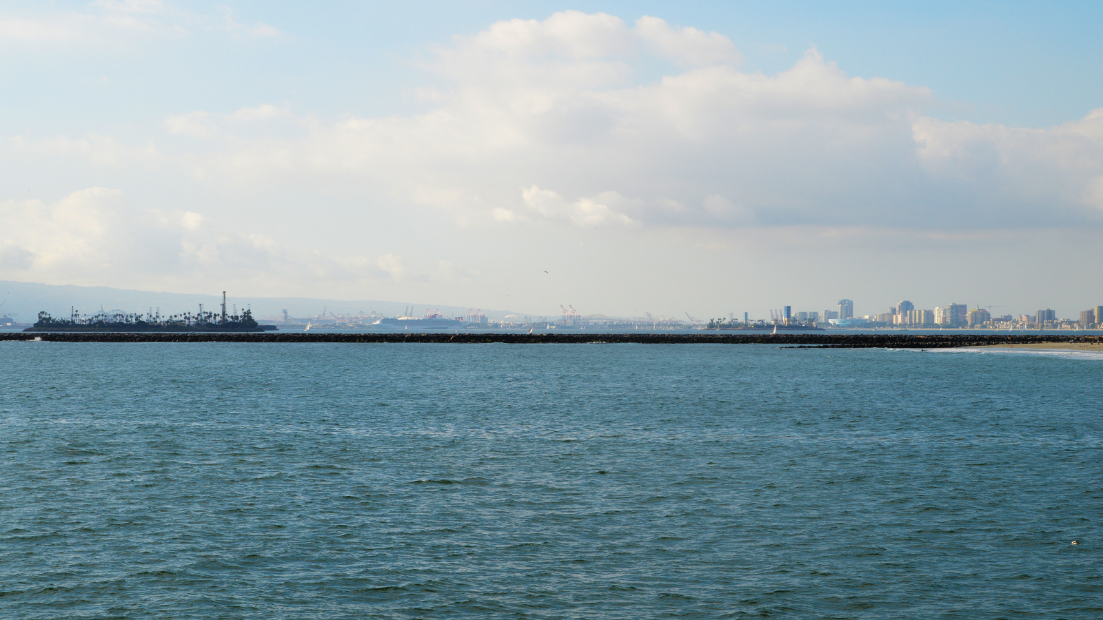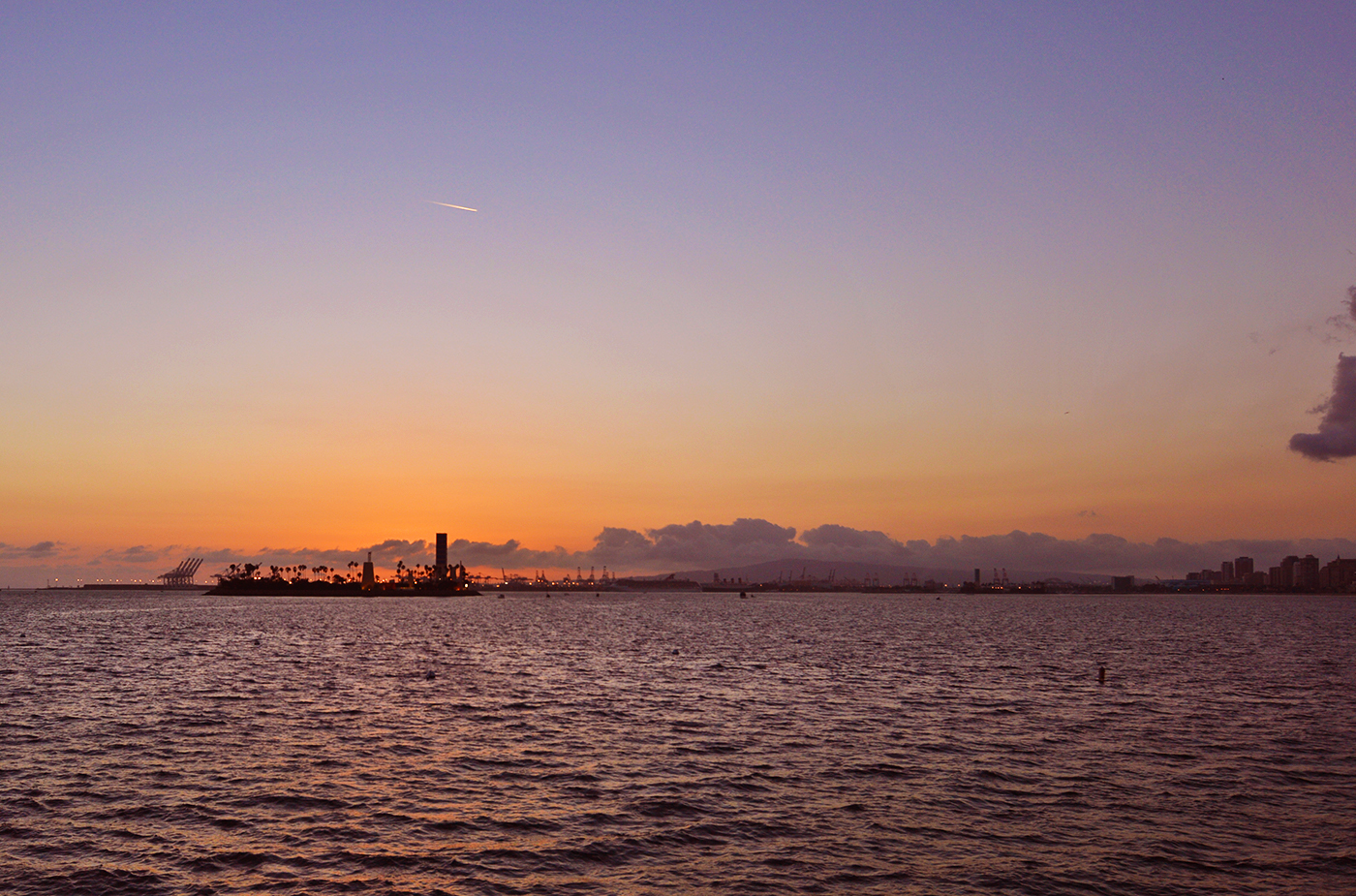From the end of the pier you can see downtown Long Beach, Long Beach port with its enormous cranes, the break water , the Queen Mary, a huge cruise ship dwarfing the Queen Mary, the oil islands, and of course the patiently waiting cargo ships. Although others prefer a less chaotic view from a pier, I found the view very interesting. The mix of ships against sailboats, against industry, against historical icons like the Queen Mary, can keep me there for hours.