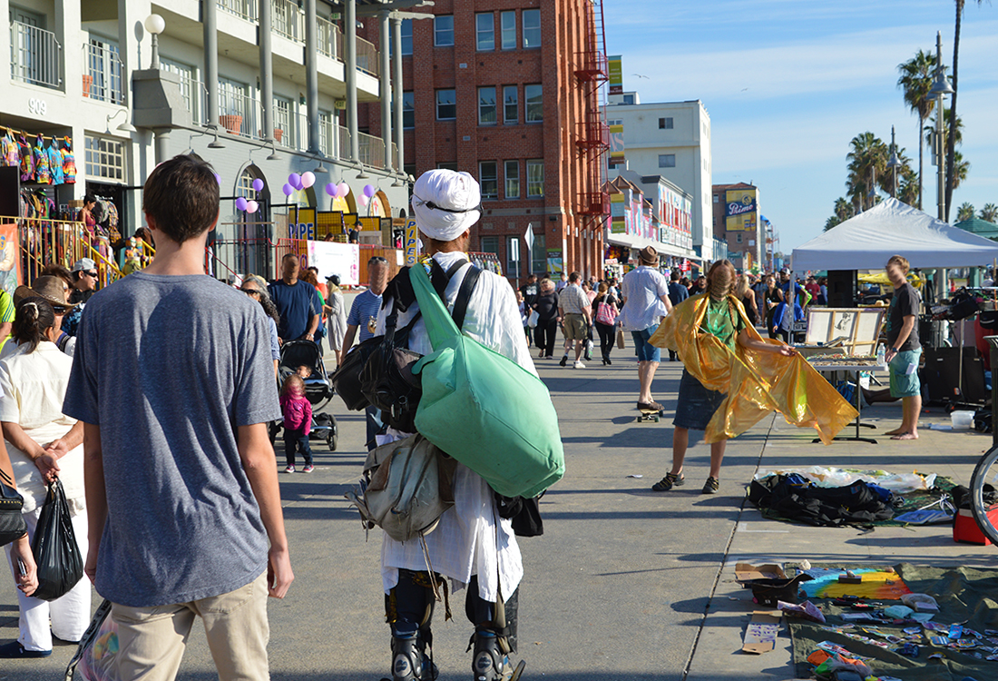 As we passed by Muscle Beach on our way back to the car there were a few chiseled men working out on various apparatuses. On some type of double bar they were performing cleverly worked out routines much to the pleasure of the surrounding crowd. One muscle man announced that if we like what we see, they would kindly accept donations. Even the muscle men were getting into the action that has become the norm for Venice Beach. In their defense, what they were doing was quite impressive unlike the guy simply standing there in a funny hat asking for money.