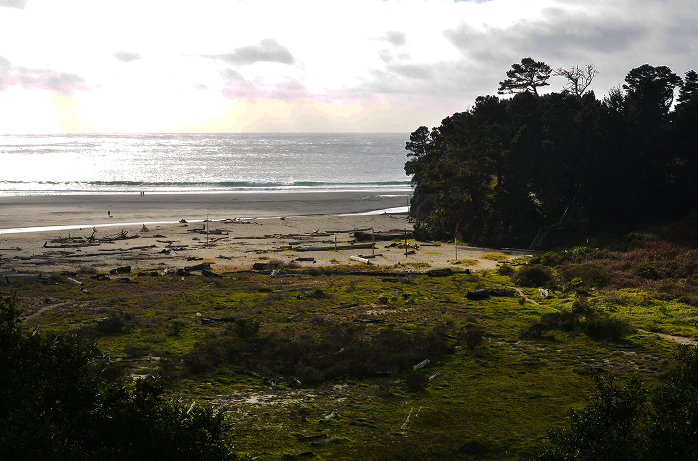 Even with diminished light we could still make out a river spilling out onto a vast empty beach with redwoods butting up against a steep cliff. The sea was home to every size rock formation and the beach was full of driftwood. I couldn’t wait to see it in the daylight and I thought to myself, “ Toto, I‘ve a feeling we’re not in Southern California anymore.”