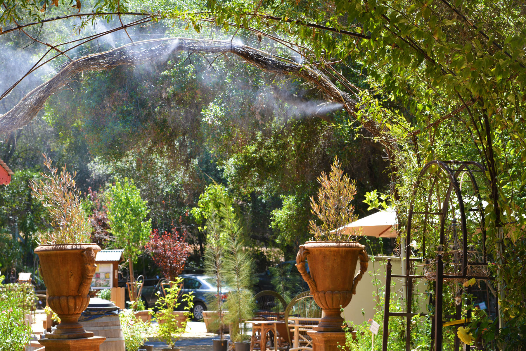 In some areas, misting machines spray cool water on you while you stroll through various arches and paths shaded by wonderful oak trees. Ambient music gently plays from hidden speakers while a huge wind chime adds to the Zen-like setting with its deep resounding ring.