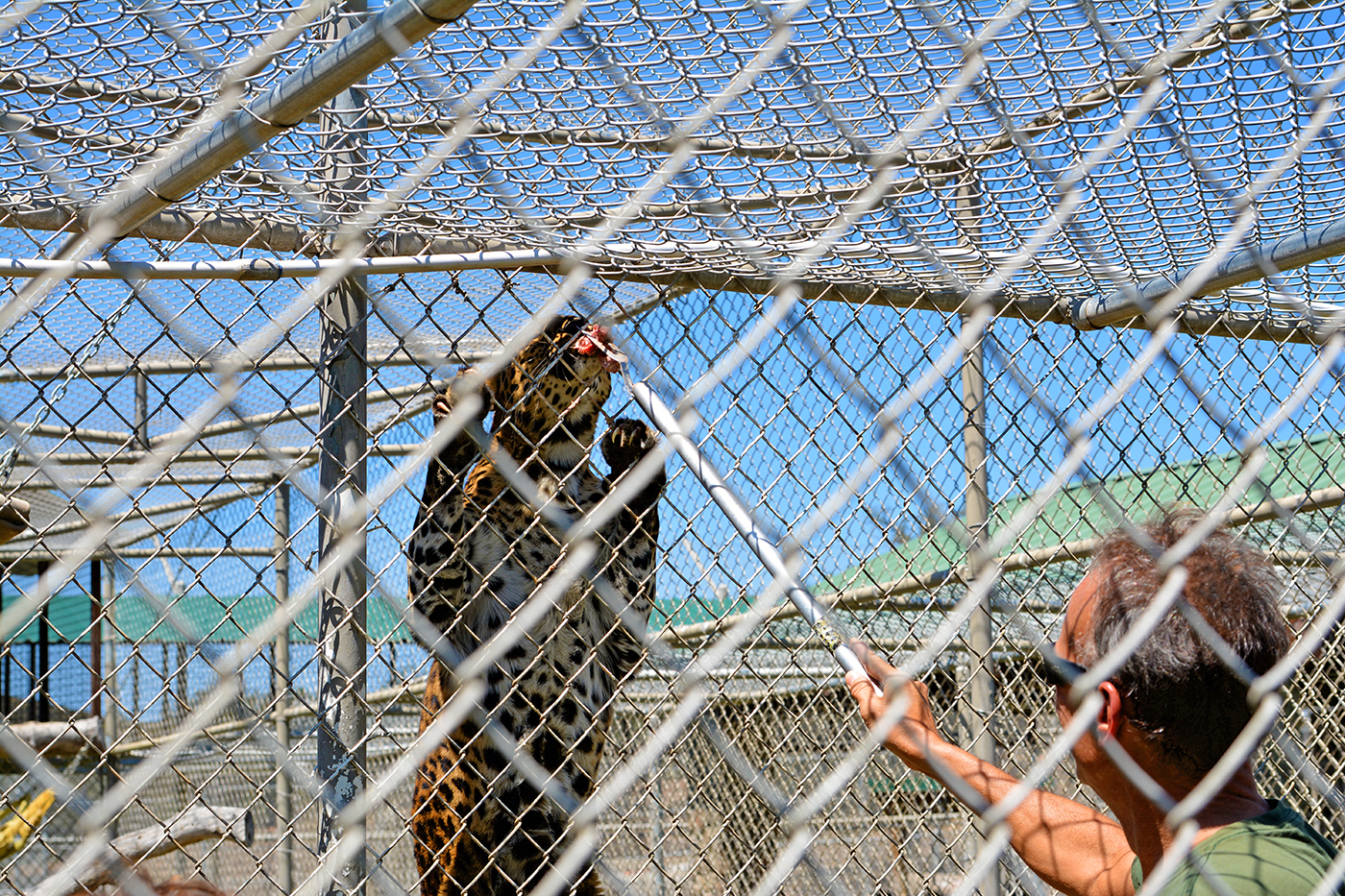 The big draw was the leopard with most of the group holding out to feed this colorful and spotted animal. Because of a generous donor, Conga the leopard had her own enclosed skyway that allowed her to view all action taking place below. She knew it was almost feeding time as she paced back and forth eyeballing the volunteers while waiting for them to arrive with her meal. Showing off her climbing abilities, she easily ascended high on the chain link fence to pick off the food from your outstretched fork.
