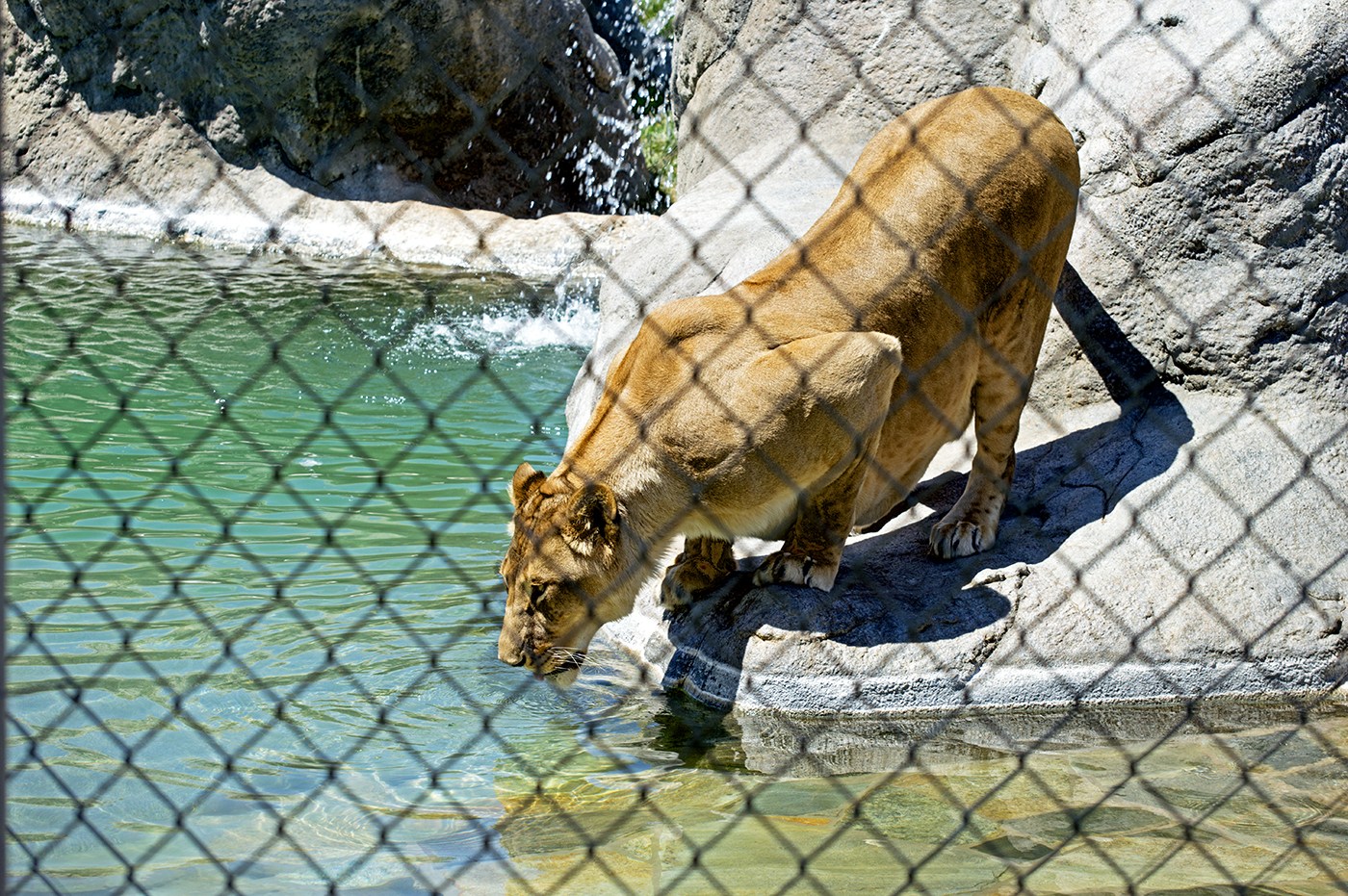 We made our way to a shaded area with chairs and tables to enjoy a cold drink after the tour. The grand finale was announced and all eyes glanced towards the large but empty area just a few feet away. Out came the lions searching for the food that was strewn about in the enclosure. After the munch-out, they drank from the pool of water and then settled in for a well deserved nap. One lion growled a little at the tigers that were caged close by but soon joined the others for the afternoon siesta. It was awesome to see them roam free in their own habitat. You were then allowed to walk freely around the facility to take a look at all the animals again.