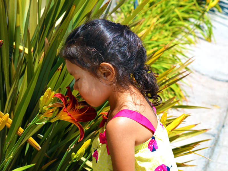 We are often told to slow down and enjoy life by stopping to smell the roses. Here, young Alina shows us how it is done at Seaport Village in San Diego.