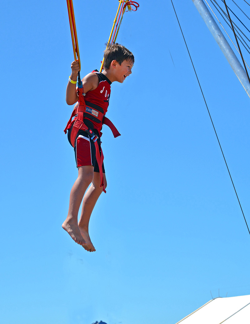 Young Parker laughs with delight on a bungee swing at an event at the embarcadero in San Diego