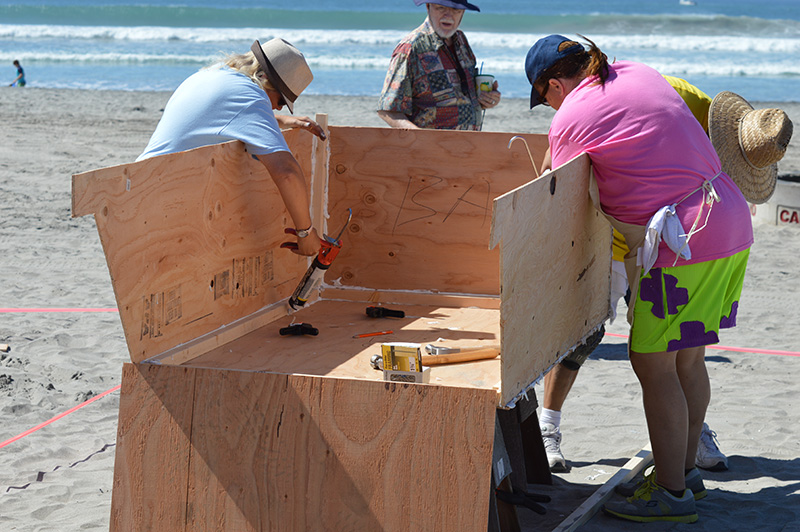 The two hours of building was made exceptionally hard because of the extremely hot weather we were experiencing here in Southern California just a few days into autumn. After an hour they had all but the front of the boat built. The event gives you a couple pieces of plywood, some other various wood, caulking, and nails. That is it!! No power tools are allowed so you are down to hammers, saws, and whatever else you can find around your house to help construct it in that limited time.