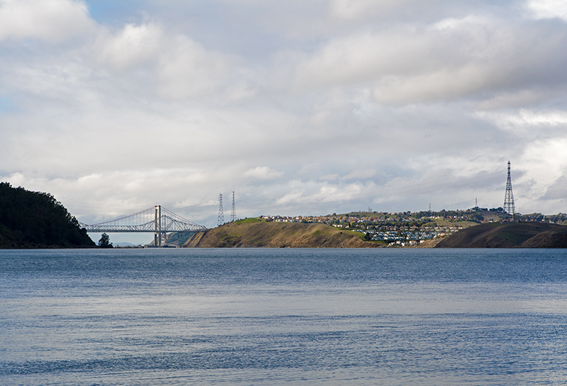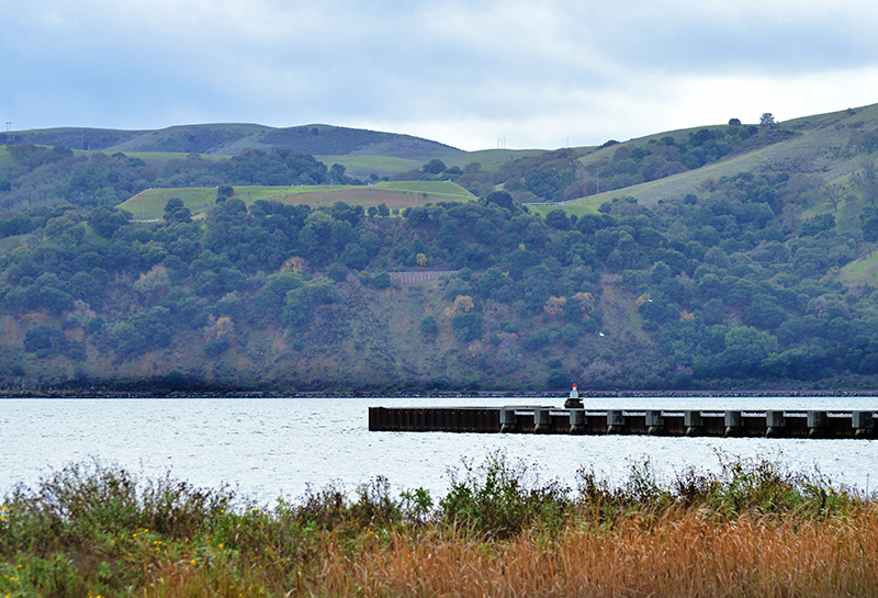 We decided to drive along the bay and get out of the car for some fresh air. As I surveyed the bay through my telephoto, I noticed another marina across the harbor and on the opposite end; a bridge in the distance which I think is the Benicia-Martinez Bridge. On the other side near that other marina, industry was in full swing with refineries and holding tanks dotting the hills. Swinging the telephoto further right it was an opposite scene with green empty hills as colorful as they could be on this gray ugly day.