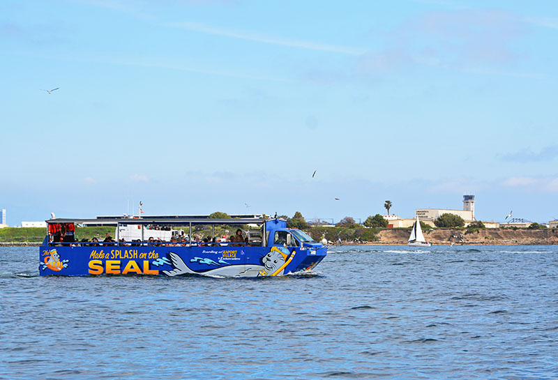 The Captain drives the vehicle while the first mate acts as a guide/narrator for the trip. Equipped with a microphone, the guide gives you informative tidbits about the city, the embarcadero, various attractions, the bay, etc. As you pass by the embarcadero you will see the sailing ship “The Star of India”, the “Midway” air craft carrier, other naval ships, a submarine, and of course the beautiful harbor. You will pass by the Coast Guards Naval Station and the San Diego Airport on your way to the water portion of the tour.
