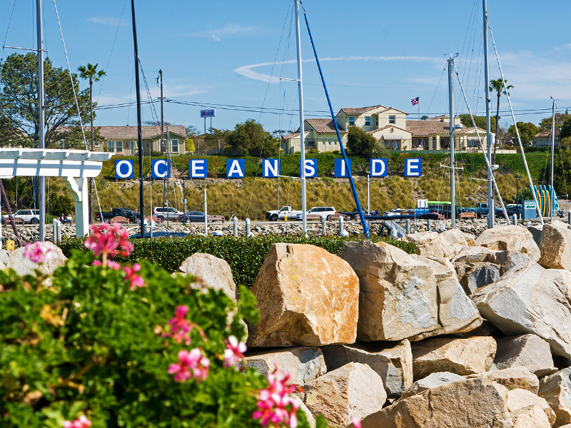 Near the fishing dock, the harbor patrol office gives you a sense of safety and the big blue Oceanside sign shines brightly on the hill.