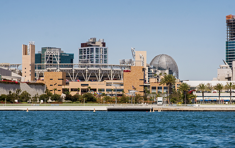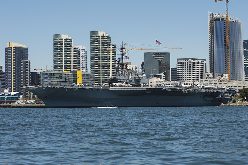 The bridge was our turning back point as we were now traveling on the east side of the bay past the shops of Seaport Village, the spectacular Petco Park baseball stadium, and the Midway air craft carrier.