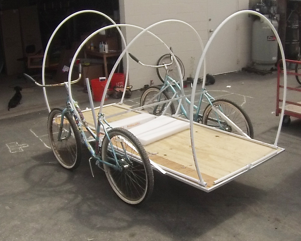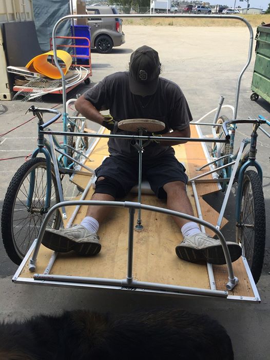 Constructing the base of the soapbox fell on our male/crazy fan. He took two normal bicycles and used their braking system for front and back. He hooked up the steering and formed a crash bar on top. The vehicle had to be constructed by the parameters set by Red Bull so we could only make it so big. Plus we wanted it to hold two people. The base was made out of wood and he used metal to hold everything together. In addition, they had to be mindful of the final weight as there was a limit.