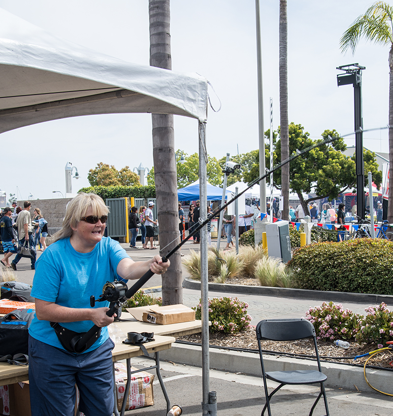 On the end of the line, the mighty trout was fighting for dear life while on the other end, Staycationer JoJo was fiercely reeling it up to the surface. As the fish tugged and pulled, the rod would bend over almost to its breaking point. Two minutes into this struggle, JoJo was huffing and puffing as her face was turning a bright crimson red. She was getting tired now although soon it would be over. You see there wasn’t really a live fish on the line, this was just a simulation, one of many booths and demos at the annual “Day at The Docks” event in San Diego.