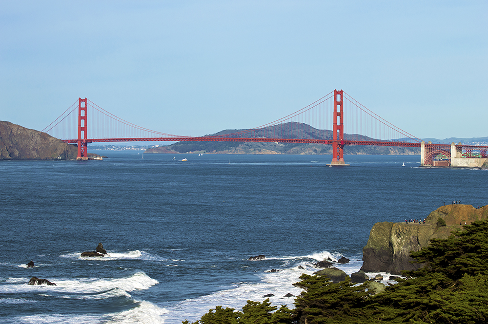 This truly is a magnificent bridge. I don’t know why, but for the first time I really noticed it even though I was driving. The length is less than two miles as it spans across the bay entrance with views of the city on one side and the bay entrance on the other. The bridge itself is a marvel. It is painted a natural red and has towers that rise 500 feet above the roadway with connecting cables and suspender ropes.