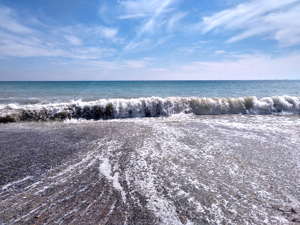 Theory three, the shoreline itself has sand but is intermixed with rocks in certain areas. So sometimes walking into the water is a little tough on the feet. It isn’t bad for a family beach except for one dangerous factor…the waves break right on shore!