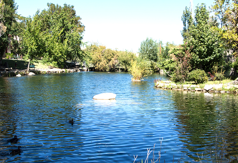Even on this extremely hot day, we still got out to explore a little. There is a super tall European looking building right at the entrance and close by is a small pond with quiet seating areas along its edges.