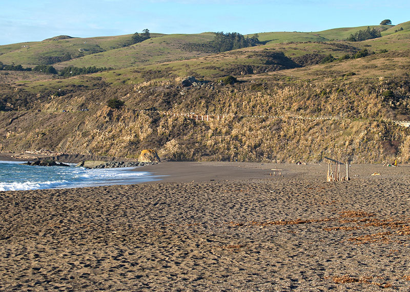 However, from this elevated vantage point we could see a few miles south, that there were people on the beach and nearby was a sea level parking lot. Exactly what we were looking for! That is where we will be going, but now how to get there? The Russian River mouth divided us from our destination and there were no signs of a bridge, so we had to back track a little.
