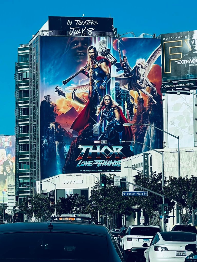 First, Sunset is known for its giant billboards. The billboards are five times the size of anything you would see along a freeway, some are as tall as the building itself. Most of the oversized posters show upcoming new movies, TV shows, or music.