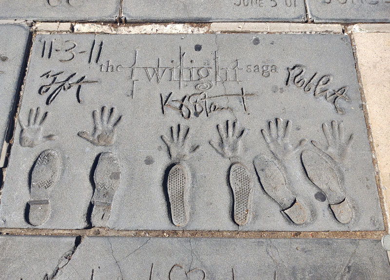 Nonetheless, it is the place where entertainers are remembered by having their hands and feet imprinted in cement. Most of the prints were from people long ago, does John Wayne ring a bell? Once again, the youngster in our group was reciting her mantra, who? Who? Who? Luckily, a few newer cement blocks were up front such as the cast of ‘Twilight’. We had a bet on who had bigger feet, Team Jacob or Team Edward. I bet on Team Jacob and won with his size 11 shoe. Jacob is Taylor Lautner and Edward is Robert Pattinson.