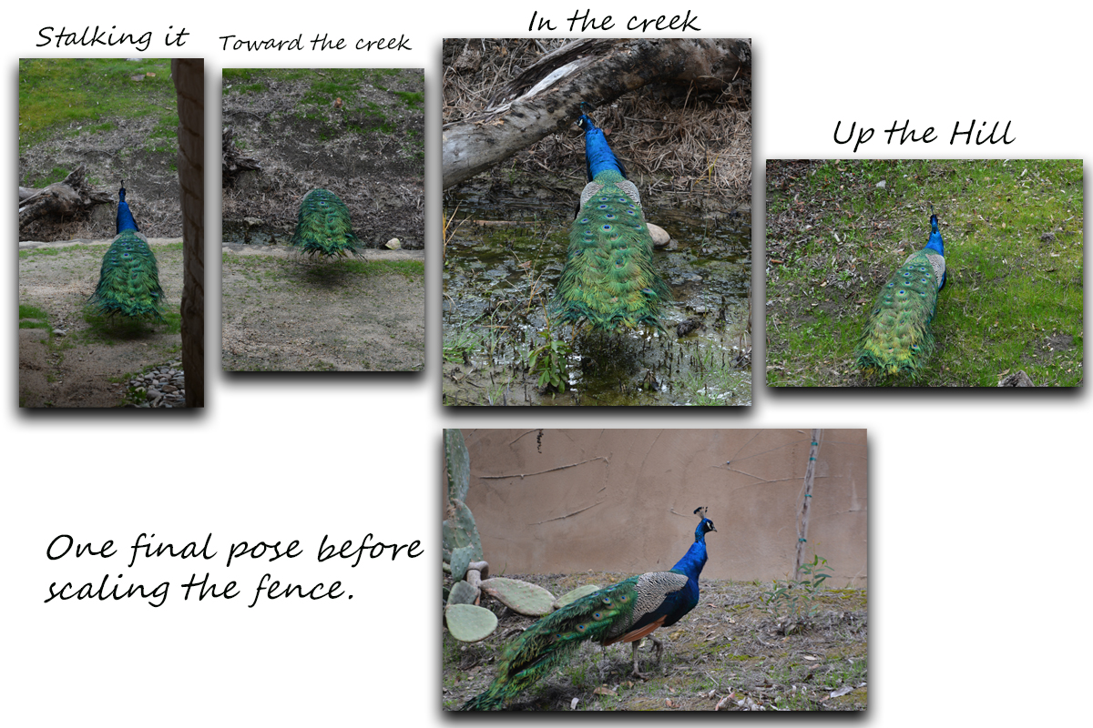 So in ending, I must go back to the peacocks. About twenty minutes after the lady told me that they were no where to be seen, I hear my name called and a finger pointing to a slowly moving beautiful bird.