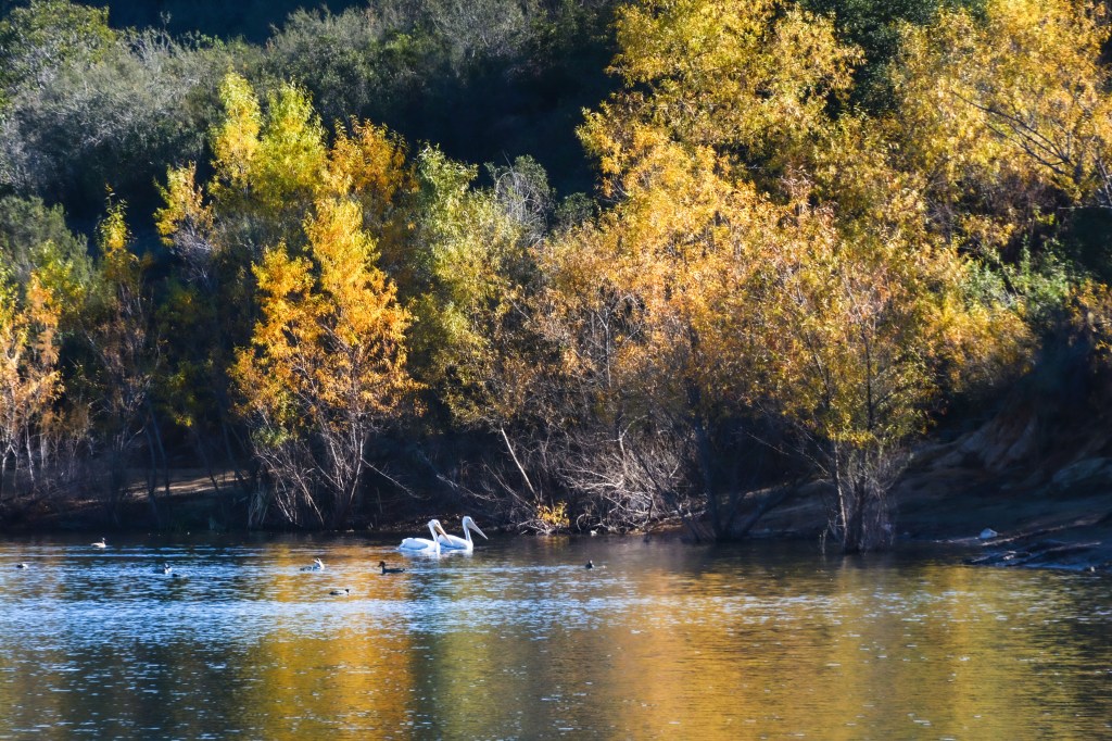 It is a surprisingly scenic lake with trees glistening in the sun as if they are about to change color. They provide a beautiful back drop as white pelicans drift by along with other various birds.