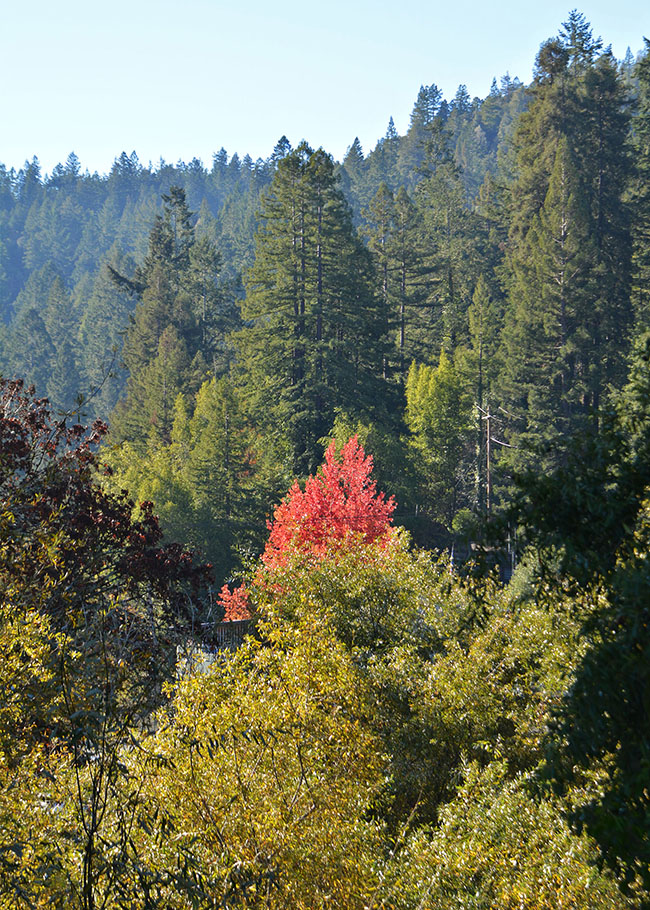On our first day in Guerneville, we set out down the road to a small sandy beach next to the Russian River to try our hand at fishing. The slow moving river weaves around town under the watchful eye of the tall and majestic redwoods. Redwoods and an occasional tree changing color, makes for a stunning back drop.